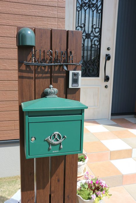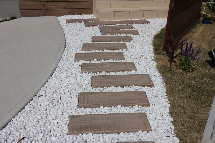 アプローチ、花壇にはTOYO工業製の木目調のコンクリート。