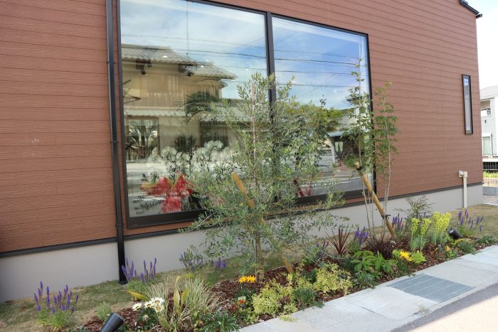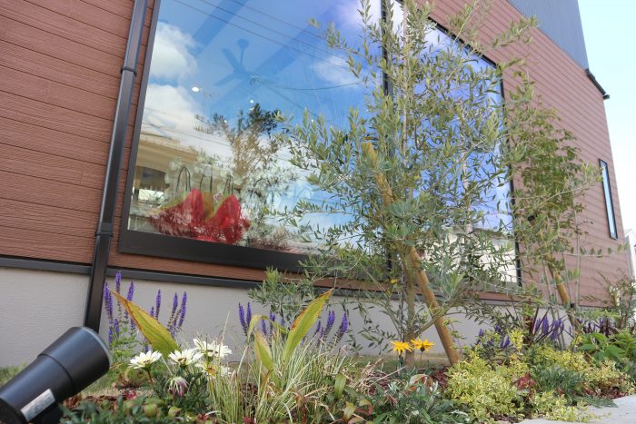 メイン道路からお店が見える大きな窓ガラスの前にオリーブとシマトネリコでやさしく目隠しをしお店の中にも太陽の光が入るように工夫しています。夜には、ライトUPでよりお店が引き立つように設置し風で揺れる植栽の影がなんとも幻想的。