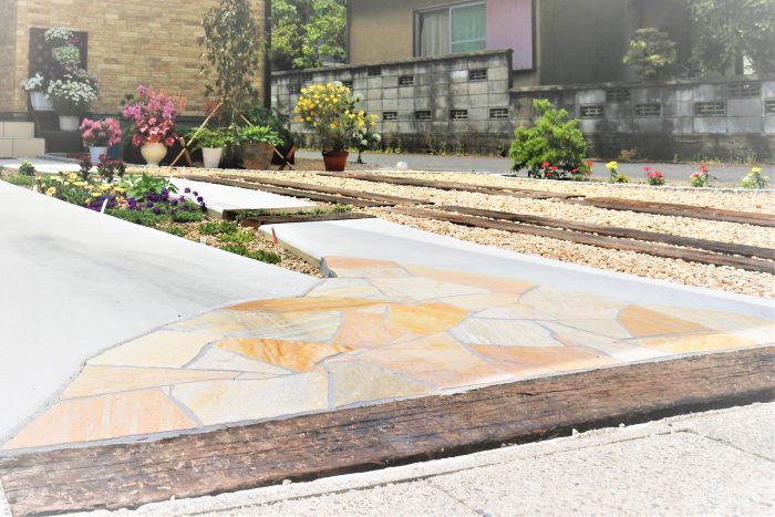 自然石の乱形石と枕木を使用して優しい雰囲気を演出。
