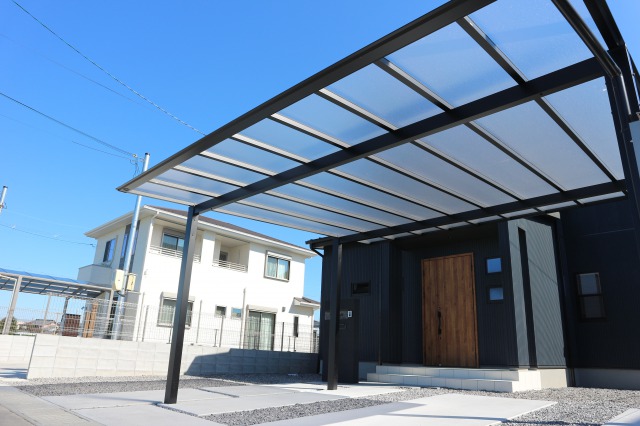 カーポートはF型の本体はブラック。アプローチもシンプルにまっすぐ土間コンクリートで施工。
