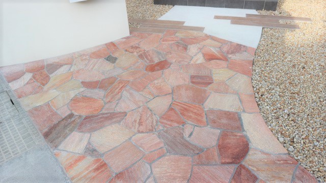 ナチュラルをベースに乱形石貼りのアプローチを敷きました。