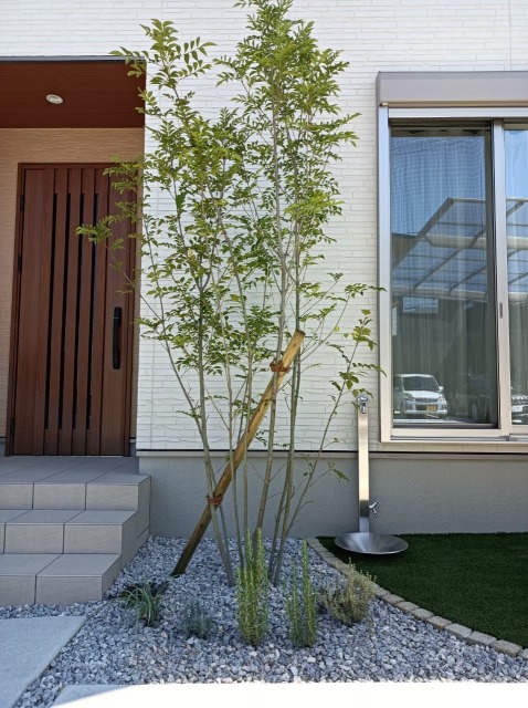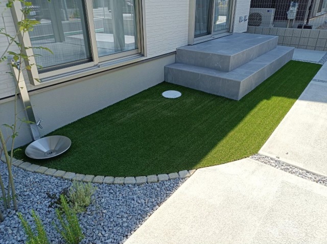 O様邸 門柱 アプローチ タイルデッキ 人工芝 立水栓