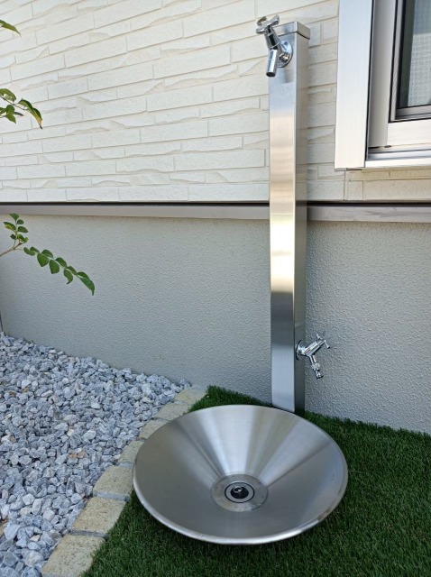シンプルですがシルバーが映える立水栓には補助蛇口も設置し、