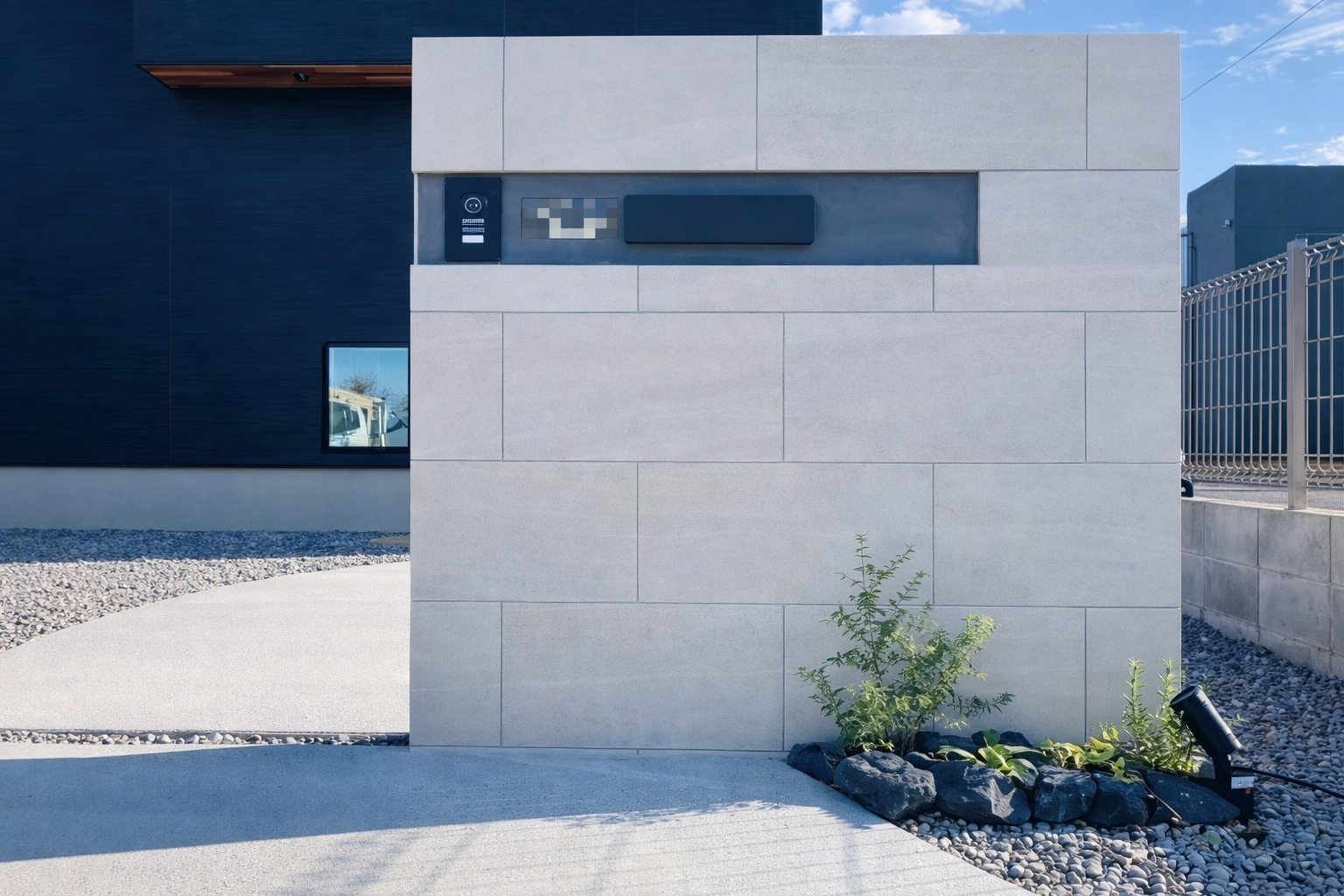 戸建て住宅の門柱まわりとアプローチ部分の左官仕上げ。