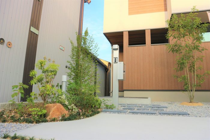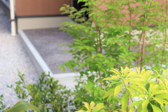 アプローチ付近の緑スペースは盛土にし高低差をだすことで
