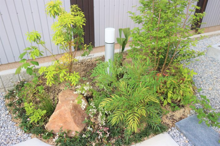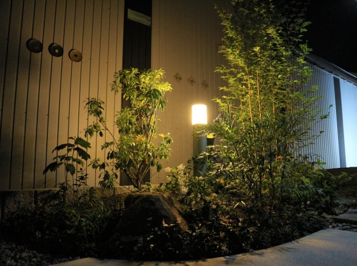植栽の配置バランスも考えまた夜の雰囲気もかわり楽しめる癒しのスペースです。
